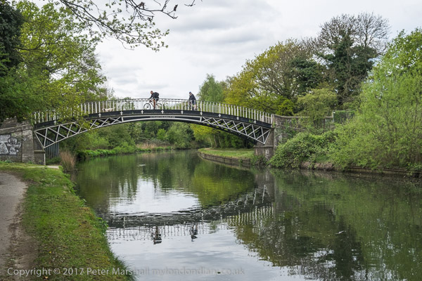 The towpath crosses to the opposite bank over Gallows Bridge.