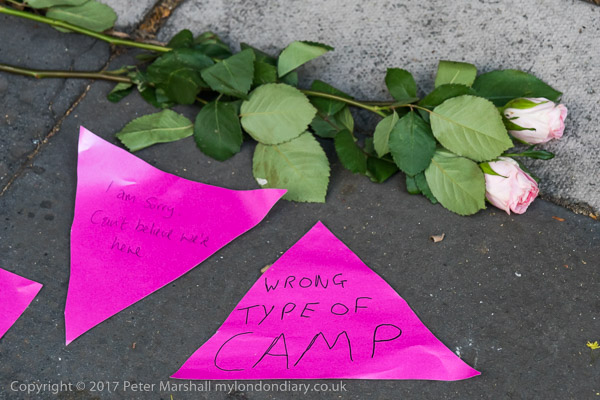 Poeple wrote messages on pink triangles