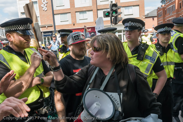 There were a few minor scuffles with EDL protesters on their way to the pub, but several hundred police kept the two groups apart, moving the UAF down to their assigned rally point on the Embankment before escorting the EDL to another location a couple of hundred yards away. After the EDL had been escorted back to the station, the UAF marched to join the women's rally at Downing St against Theresa May's collusion with the UDP to prop up her minority government.