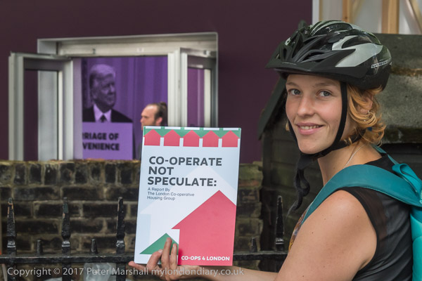 Members of the London Co-operative Housing Group had brought copies of their new report 'Co-operate Not Speculate' to photograph outside the London Real Estate Forum.