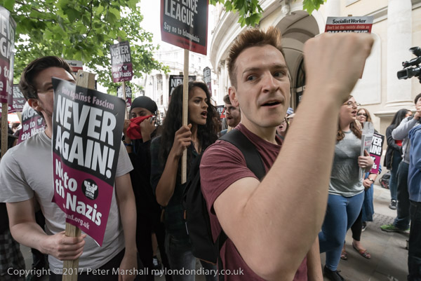 After the rally celebrating the Corbyn's leadership and performance in the General Election, most of those present walk to Downing St to celebrate anti-racism and multiculturalism and against all bigotry.