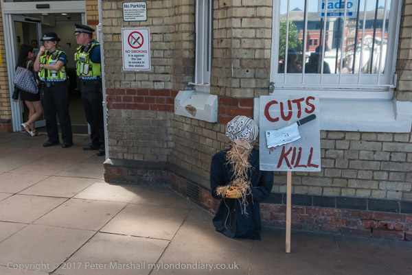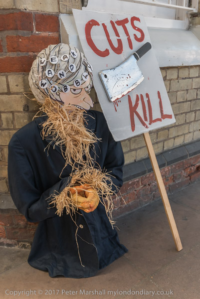and a straw effigy of May next to a 'Cuts Kill# banner with a cleaver