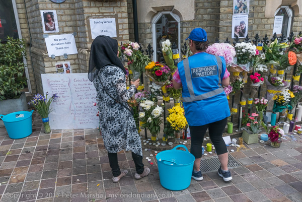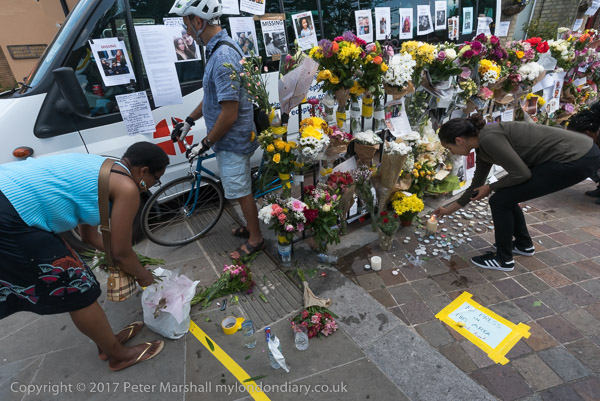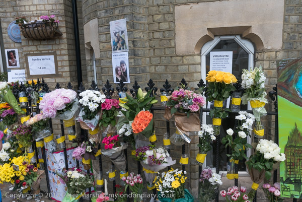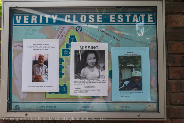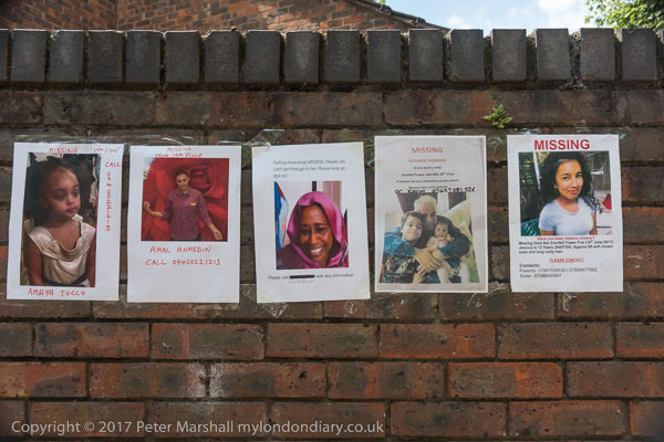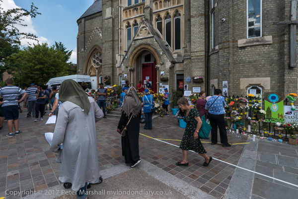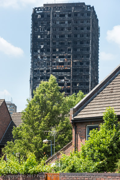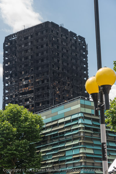 Grenfell Tower from the church. Police barriers prevent a closer approach