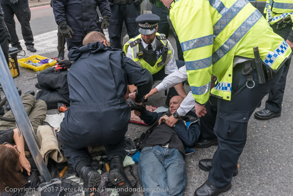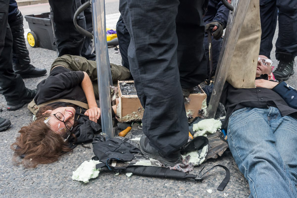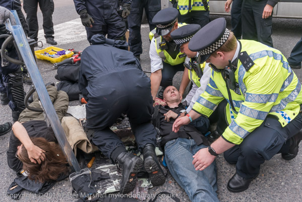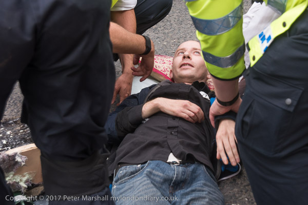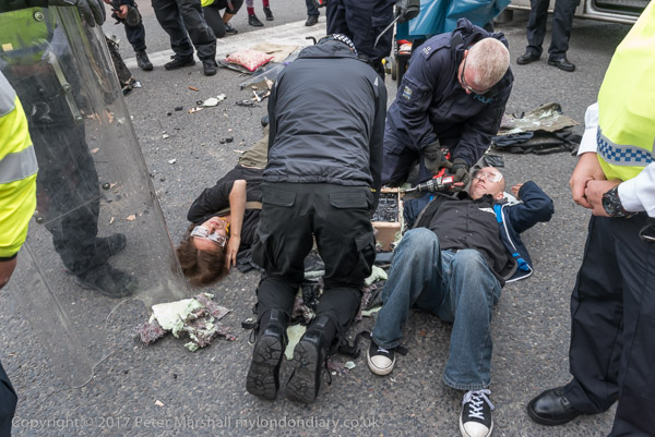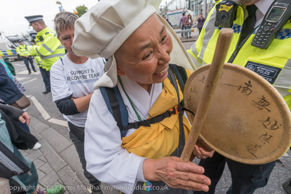 One of the Buddhists arrives and is moved onto the pavement by a police
