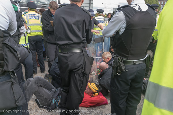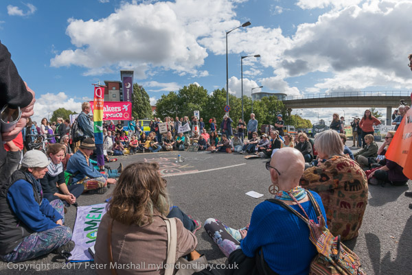 and protesters sitting on the blocked road