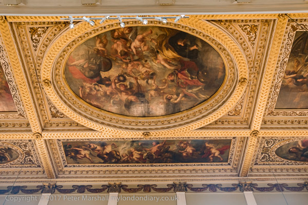 Rubens and his studio painted the ceiling in Antwerp and it was shipped