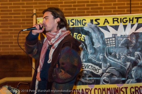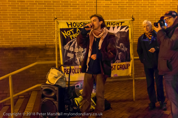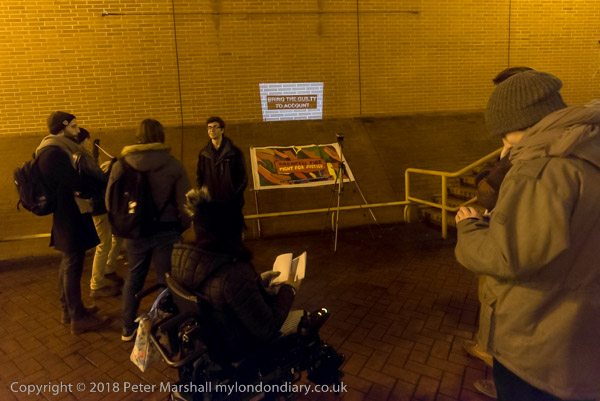 Andrew Cooper stands with his banner and posters. He holds a pair