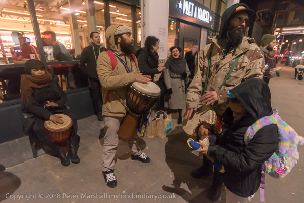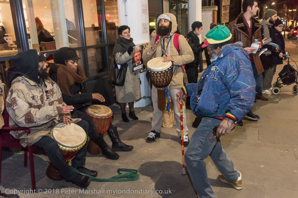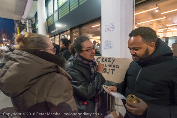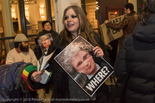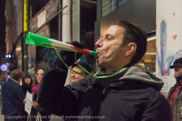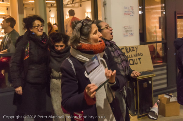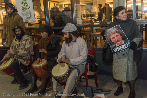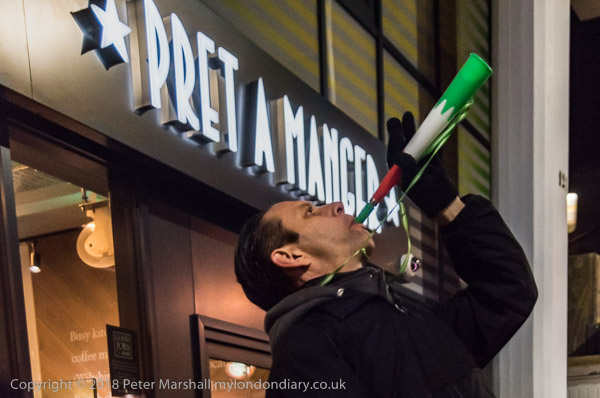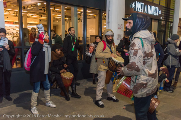 People dance and shout 'Shame on You!' pointing to Pret-a-Manger