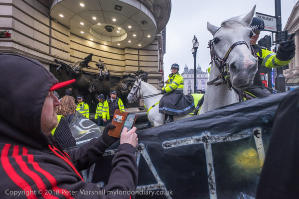 Police made several attempts to stop their march with a small force of officers including two poorly controlled horses who endangered the public on some of the crowded West End streets. They kept trying to stop the march going where it intended and making it go back to Downing St, but there were not enough of them to stop people simply walking around their various cordons.