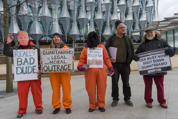 They have protested at the Grosvenor Square US embassy every month since 2007 and will continue outside the new embassy until the illegal and immoral camp is closed down. They say that with President Trump's plans to keep Guantanamo open and possibly send more people there it is important to continue to stand against this shameful injustice. There is no evidence against most of those held and tortured there which would stand up in a court of law, and some were simply foreigners in the region seized by merely to gain cash rewards from the US forces.