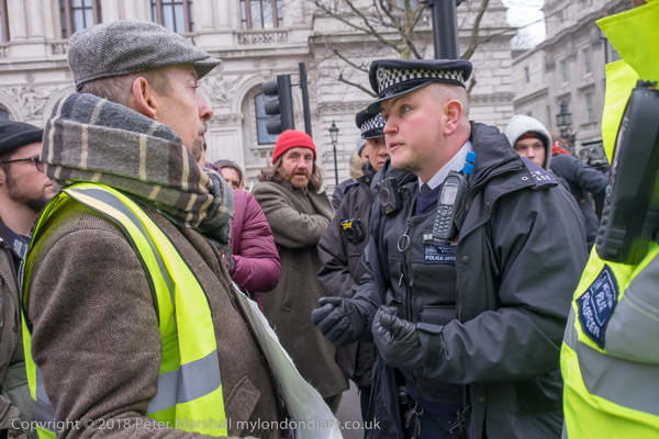 A policeman tells one of the protesters he is obstructing the highway
