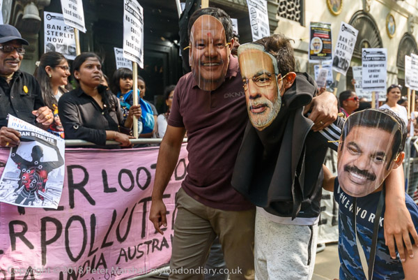 Indian Prime Minister Modi's mask is above a grotesque parody of Vendanta