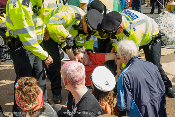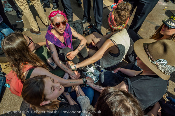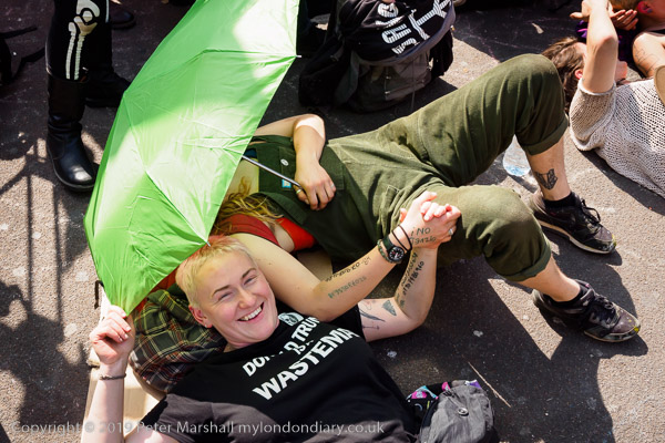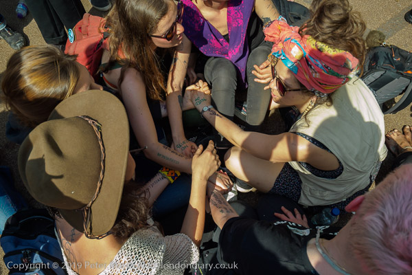 Outside the cordon, protesters wait. A few dance, but most just sit.