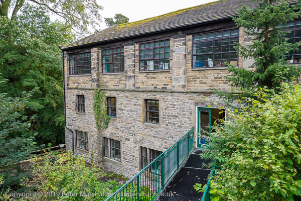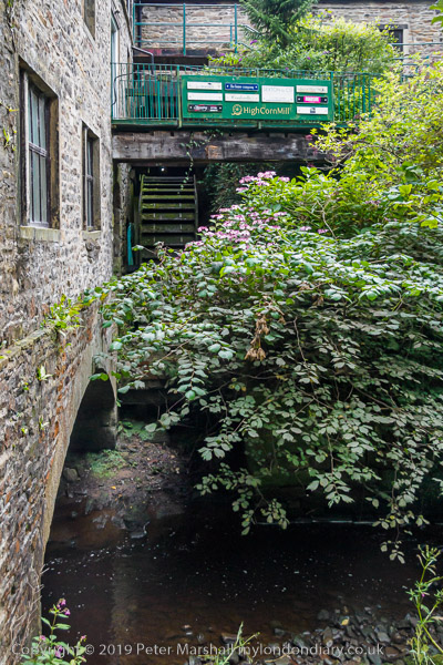 The back of the High Corn Mill. The wheel is hidden by the trees at