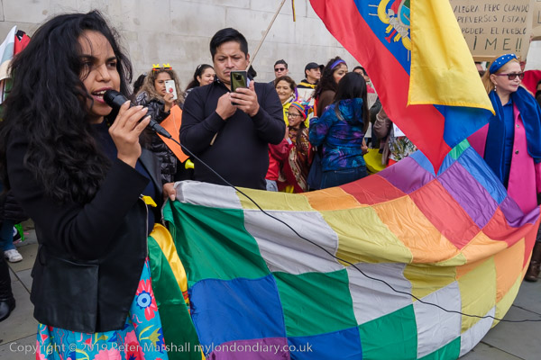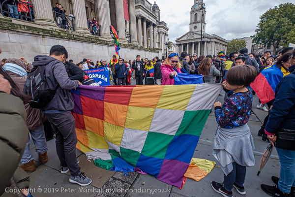 Claudia holds an indigenous flag, the Qullasuyu Wiphala