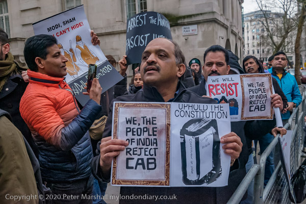 A protest at India House condemns the violence against Muslims which they say is spearheaded by Hindu supremacist BJP-RSS thugs and openly facilitated by the Delhi Police.