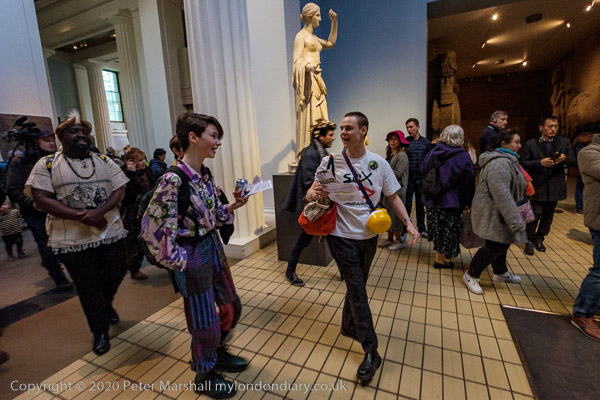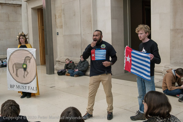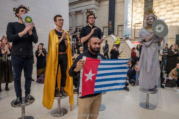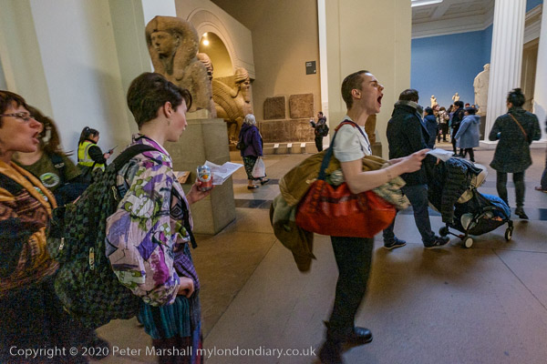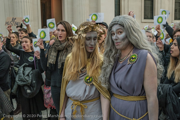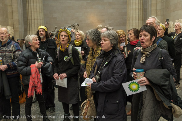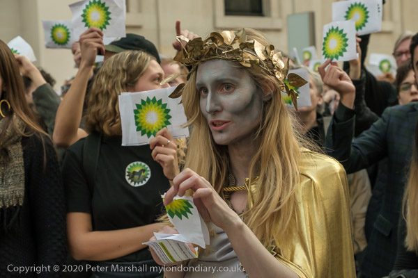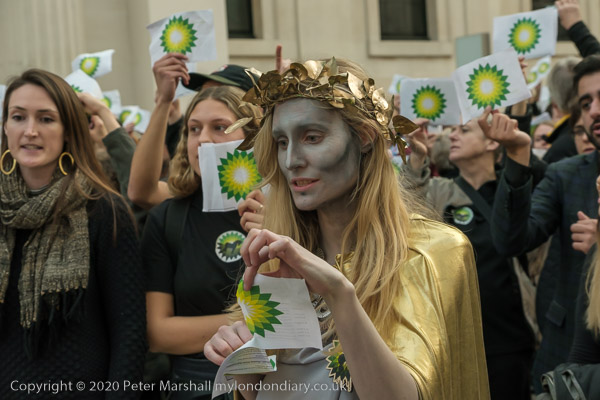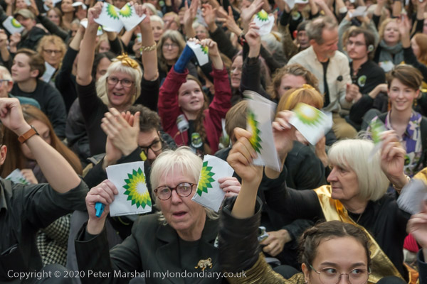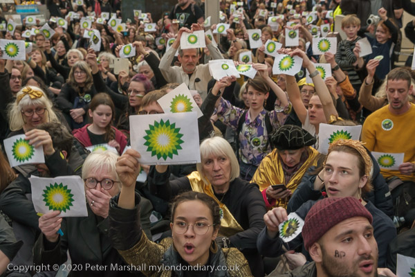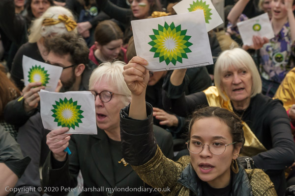 Finally, the protesters fill the Great Hall and hold up BP logos