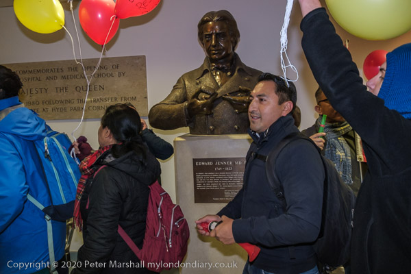 Protesters dance past Edward Jenner who learned surgery and anatomy at St