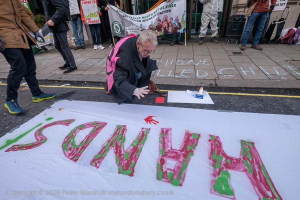 A man starts painting the slogan 'GLENCORE BLOOD ON YOUR HANDS' on