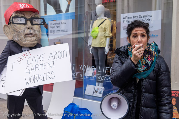 People from the Clean Clothes Campaign and Labour Behind the Label protest outside the Uniqlo flagship store in Oxford St against Japanese fast fashion company Uniqglo which is cheating workers who made clothes it sold.